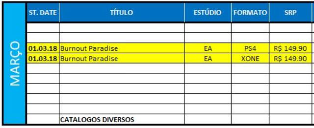 Het zou zomaar eens kunnen dat we volgend jaar een Remastered versie van Burnout Paradise kunnen verwachten voor PlayStation 4 en Xbox One. Een Braziliaanse retailer heeft namelijk de game op een release lijst gezet voor maart 2018. Volgens de lijst gaat de game 149,90 Braziliaanse Reaal kosten, wat gelijk staat aan ongeveer 38 euro.